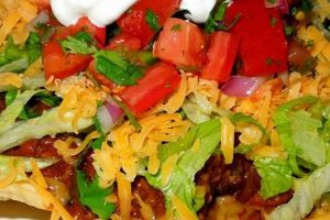 A typical preparation involves a base of crisp tortilla chips layered with seasoned ground beef, often simmered with onions, tomatoes, and spices like chili powder and cumin. Lettuce, cheese (cheddar, Monterey Jack,... Read more »