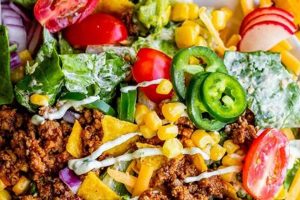 A dish combining cooked chicken, typical taco seasonings, and salad ingredients offers a flavorful and customizable meal. Variations can include traditional taco components such as shredded lettuce, diced tomatoes, cheese, onions, and... Read more »